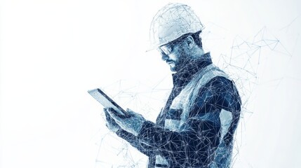 Abstract polygonal isolated engineer in technology style on a white background. Industry safety or architecture concept. Worker in white helmet holding tablet. Low poly wireframe vector illustration.