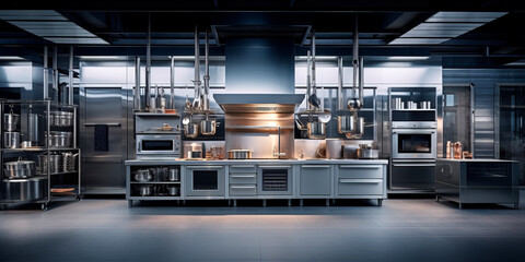 Design of a professional kitchen for a restaurant or cafe. Metal table. Kitchen equipment for catering. Cooking space.