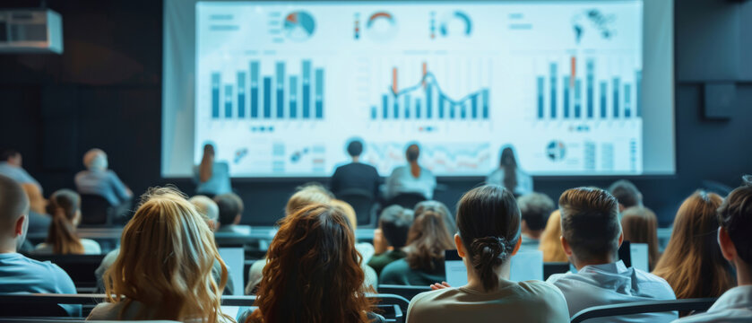 Smiling public speaker hosting AI convention gathering tech startups managers and academics. IT expert moderating symposium, teaching industry workers how to tap into artificial intelligence, camera B