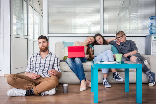 Depressed and sleepy young freelancers experiencing the disadvantages of self-employment through exhaustion or lack of contracts in a co-working office space