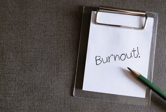 Paper Clip on copy space background with grunge handwriting BURNOUT, means reaction to prolonged or chronic job stress lead to physical and emotional exhaustion state