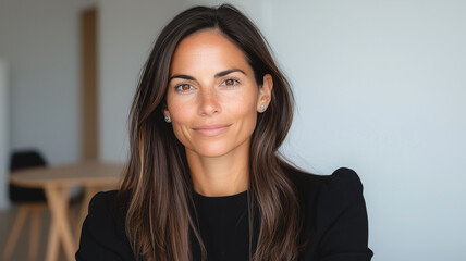 A portrait headshot photo of a friendly professional CEO executive business worker: A professional woman with long brown hair and a warm smile confidently poses in a navy blazer and white top, se