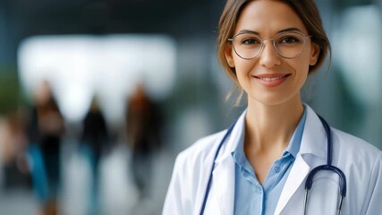 Portrait of a young woman doctor in a white coat standing in a bright hospital hallway, exuding confidence and compassion. She symbolizes modern medicine, patient care, and professional healthcare