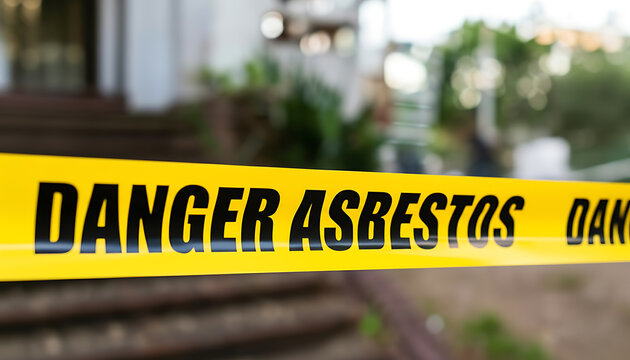 Caution tape warns of asbestos danger, highlighting the risks of exposure and need for professional remediation in older buildings and construction sites
