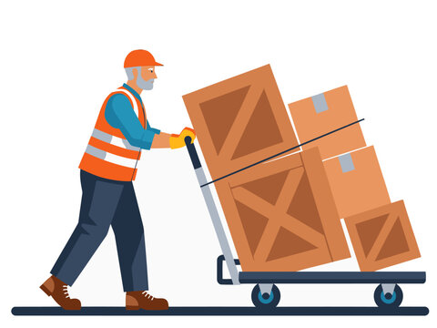 A construction worker pushes a cargo cart, demonstrating strength and efficiency. Clear composition, bright colors, and professional setting. Ideal for business and logistics visuals.