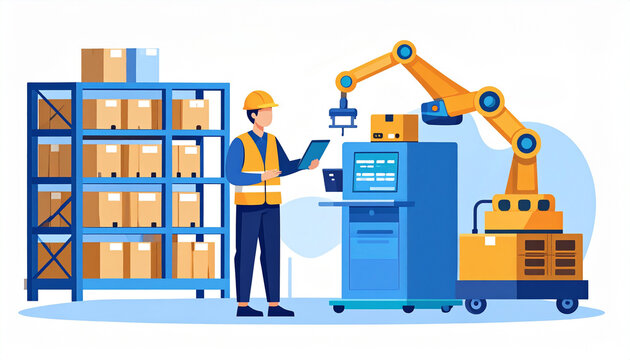 Warehouse worker overseeing automated robot arm in a warehouse setting. Illustration shows efficiency of technology in industrial environment