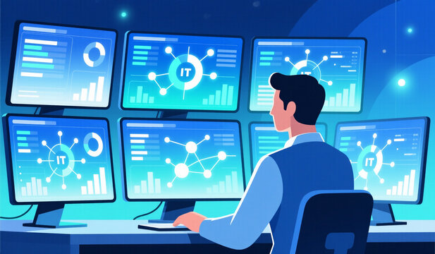 IT Specialist Analyzing Network Data On Multiple Computer Monitors