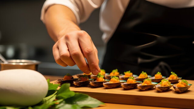Chef preparing gourmet appetizers in a professional kitchen setting