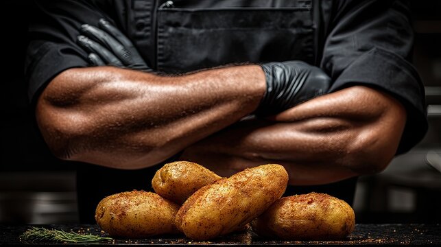 Strong chef showcases perfectly seasoned potatoes with an impressive display of culinary expertise in a professional kitchen setting