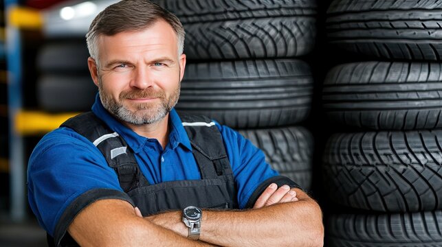 Mechanic proudly smiles in modern workshop filled with stacked rubber tires and showcases expertise in automotive care