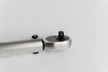 Close-up view of a metallic ratchet wrench tool with a shiny surface and intricate detailing, showcasing craftsmanship and precision in mechanical engineering and repair work