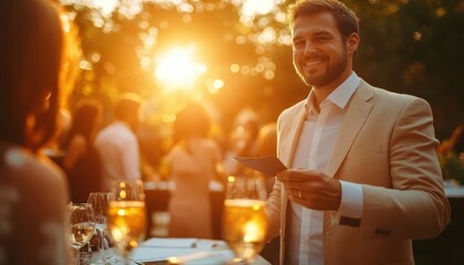 A marketing professional exchanging cards at an outdoor event, goldenhour lighting enhancing the lively atmosphere