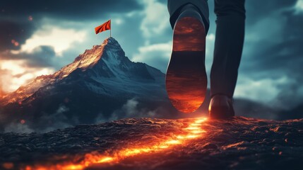 A close-up of a businessman's foot walking along a glowing path toward a mountain peak with a flag, symbolizing ambition and the journey to success.