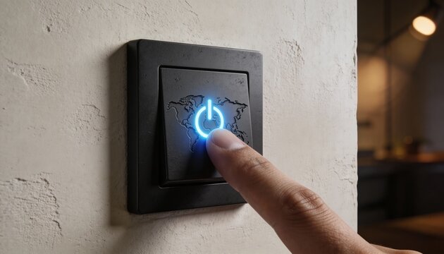 A professional close-up of a hand turning off a modern light switch featuring a glowing Earth power symbol, representing energy conservation and global participation in Earth Hour.