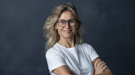 Confident woman with glasses smiling in casual white t-shirt, arms crossed. Professional portrait with dark background. Suitable for business, casual, confident themes in stock photos. AI.