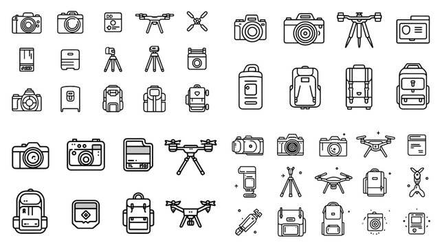 Minimalist line icons of photography and drone equipment including cameras, tripods, drones, backpacks, and accessories, perfect for creative and travel designs.