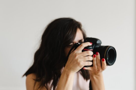 Content creator holding a camera, focusing on photography. Camera in hand, capturing moments. Photography enthusiast with a camera, ready to shoot. Content creator taking photos with dslr camera.
