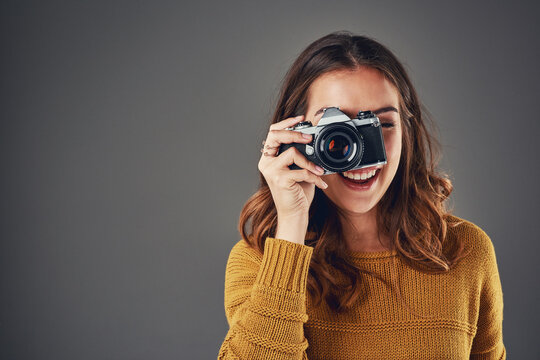 Woman, portrait and photographer with camera for picture, memory and professional in studio mockup. Student, happy and photography equipment for creativity, portfolio and space by gray background