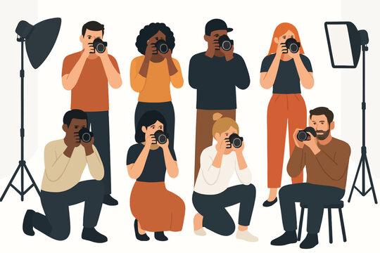 Diverse group of photographers capturing moments with their cameras in a studio setting.