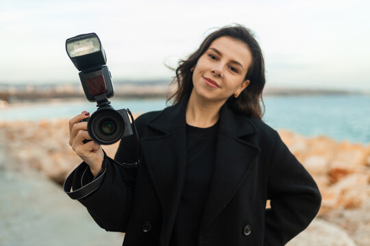 Young female photographer taking pictures outdoors by the sea, smiling while holding a professional camera with flash, capturing moments on a rocky coastline at sunset.