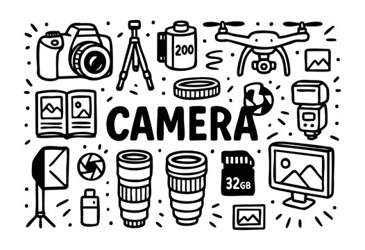 Camera doodle illustration — photography and videography equipment, including a drone — stock vector.