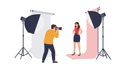 Photo studio white backdrop lit with side and head softboxes. Professional photo shooting setup with studio lights, realistic vector illustration. Studio photography scene mockup.