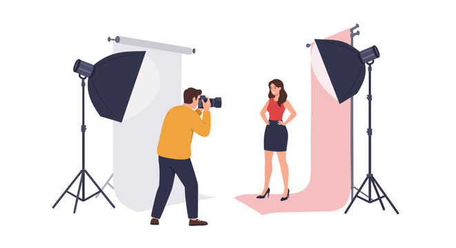Young pretty woman model poses for a photographer at a photo studio during a photo shoot. Flashes of studio lights.