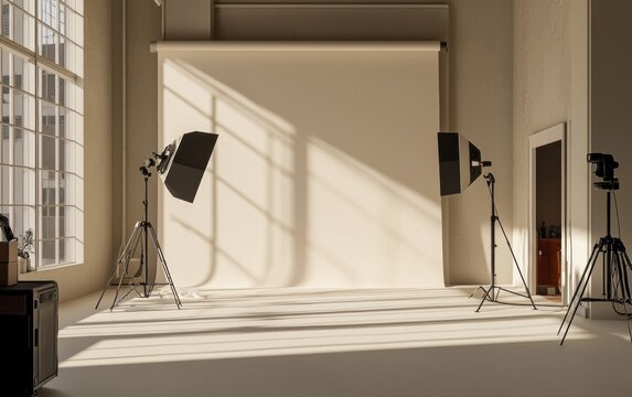 Empty photography studio with natural light streaming through large windows, illuminating a neutral backdrop.  Professional lighting equipment is set up and ready for a photoshoot.  The overall