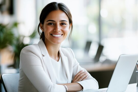 Smiling young Hispanic businesswoman sitting at desk with laptop, confident female executive in her 30s, professional entrepreneur portrait in modern office
