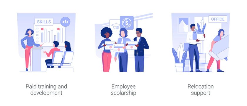 Employee education isolated concept vector illustration set. Paid training and development, employee scolarship, relocation support, tuition assistance program, loan payment vector cartoon.