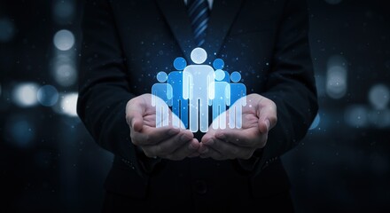 Businessman holding a glowing icon of a team. Concept for human resources, customer relationship management, and leadership.