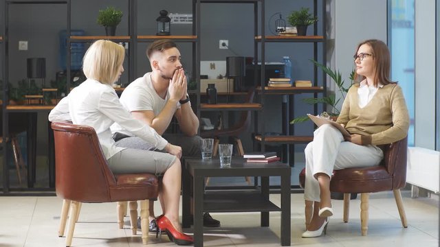 Female professional psychologist conducts mental health therapy to young married couple. Therapy, problems, psychology, people relationships concept