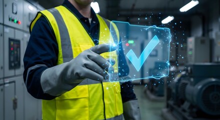 Worker in safety vest checks digital confirmation on glowing screen in industrial power plant setting.