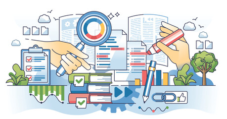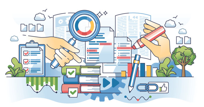 Document analysis and legal document information research outline concept. Analyzing agreement or business deal with inspection and result report vector illustration. Detailed text investigation.