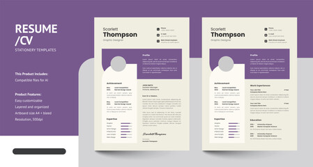 Minimalis CV Resume and Cover Letter Design Template. Super Clean and Clear Professional Modern Design. Stylish Minimalis Elements and Icons with Purple Color - Vector Template