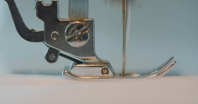 Close up view of sewing process. Senior woman's hands with sewing machine and white fabric at workplace. Hobby or professional occupation for retiree