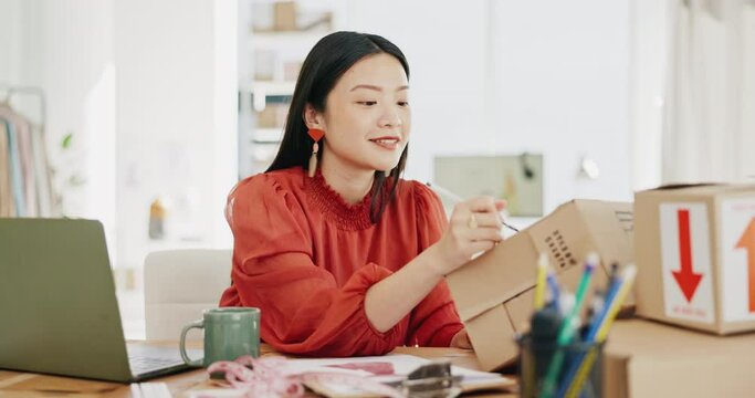 Box, ecommerce and laptop with asian woman writing for order, delivery and online shopping distribution. Seller, package and retail with small business owner for parcel, shipping and labelling