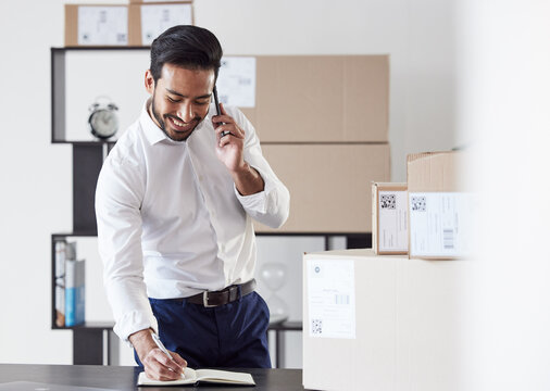 Phone call, business notebook and happy man with delivery notes, writing order schedule or planning shipping distribution. Supply chain, ecommerce planner or logistics person talk with cellphone user