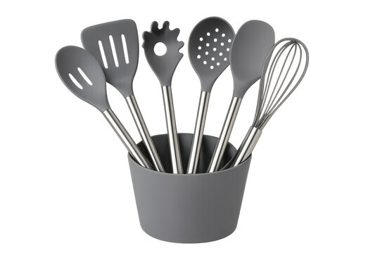 Silicone and stainless steel kitchen utensil set with spatula, whisk, spoon, and pasta server in holder, cooking tools