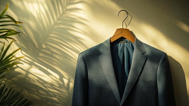 A minimalist scene showing a freshly cleaned suit hanging neatly on a wooden hanger against a plain background, symbolizing professional dry cleaning services