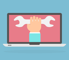 man cleans a laptop with a brush for blowing dust cooling system. Repair and service laptops and PC Advertisement of repair service for electronics and devices
