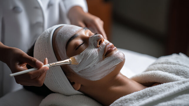 Woman receiving relaxing facial skincare treatment at beauty spa with professional therapist