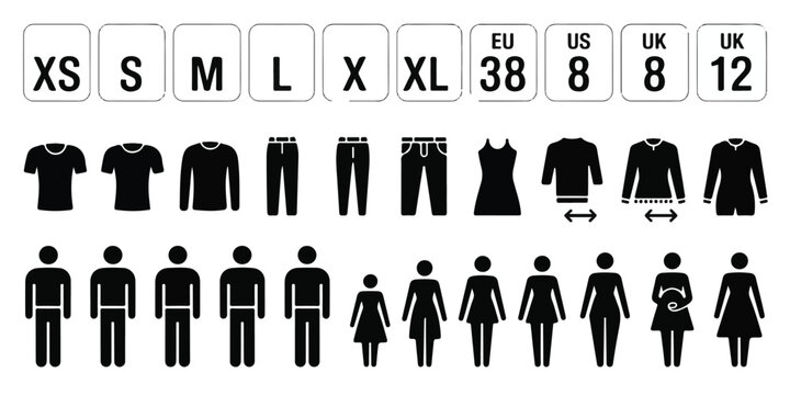 Minimalist black and white clothing size and gender icon set, professional stock-ready, bold readable text, clean silhouette icons, organized layout, modern commercial design, high market appeal.