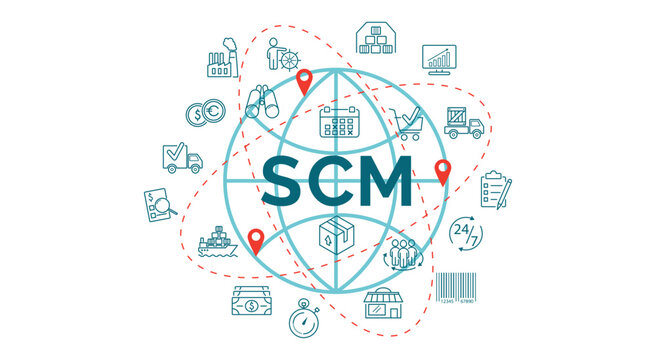 SCM banner. Marketing, plan, blue, scheme, goods, communication, transportation, advertising, market, enterprise, profit, word, map, success, truck, graphic, planning vector illustration.