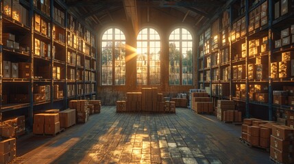 Warehouse with Shelves and Boxes at Sunset - Generative AI