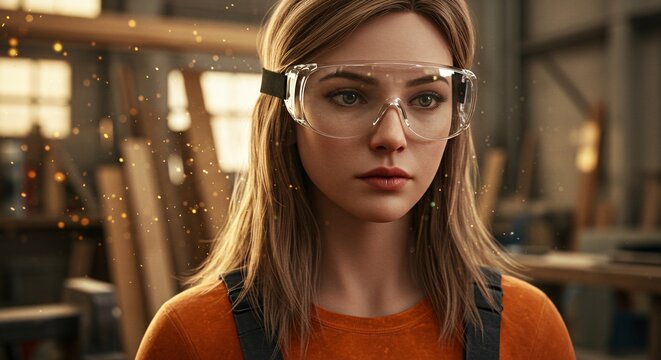 Young woman wearing safety glasses, likely in a woodworking or construction workshop.