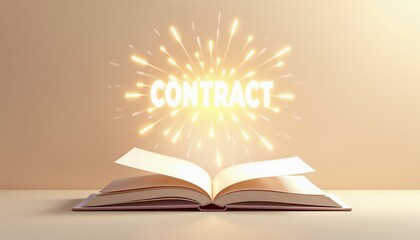 Open book with glowing text "contract" on beige background