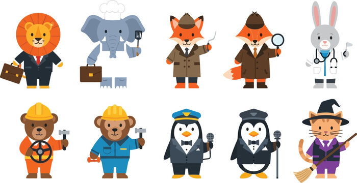 Cartoon animals dressed in various professions including detective doctor and construction worker