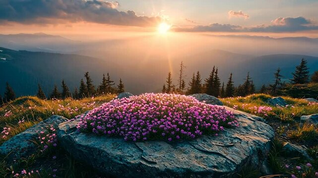 Majestic mountaintop vista at sunset.  A profusion of purple wildflowers adorns a large rock