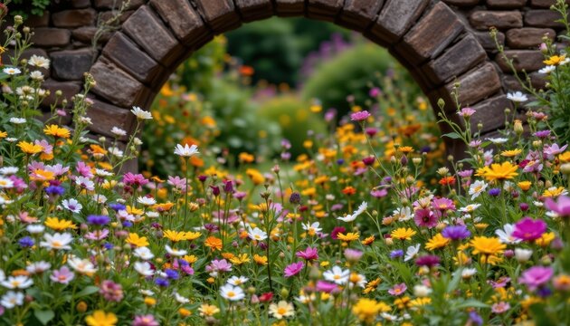 A riot of wildflowers grows at the base of the archway, their profusion of colors and textures creating a soft and natural contrast to the more cultivated blooms above.